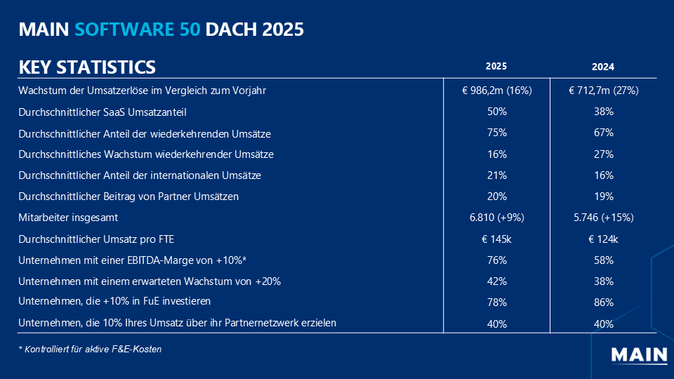Bereits in seiner vierten Auflage hat sich das Ranking Main Software 50 DACH als anerkannter Maßstab zur Identifikation von Spitzenleistungen in der Softwareindustrie etabliert. Das Ranking würdigt herausragende Softwareunternehmen, die sich durch außergewöhnliches Wachstum, hohe Innovationskraft und starke Wirkung am Markt auszeichnen – und unterstreicht damit Mains anhaltendes Engagement, die Stärke des Sektors zu fördern und sichtbar zu machen. Im Unterschied zu reinen Meinungsrankings basiert die Bewertung auf objektiven Unternehmensdaten. Die Leistung wird anhand zentraler Kriterien wie Wachstum, wiederkehrenden Umsätzen, Profitabilität, Internationalisierung und Innovation beurteilt.